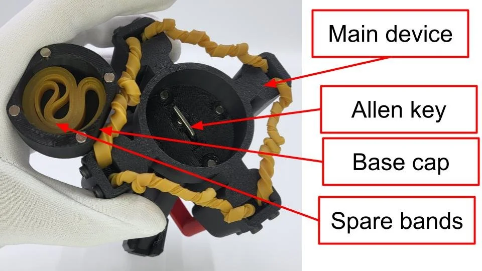 The 4 Pillars of Pain Device contains everything you need to replace a broken rubber band.